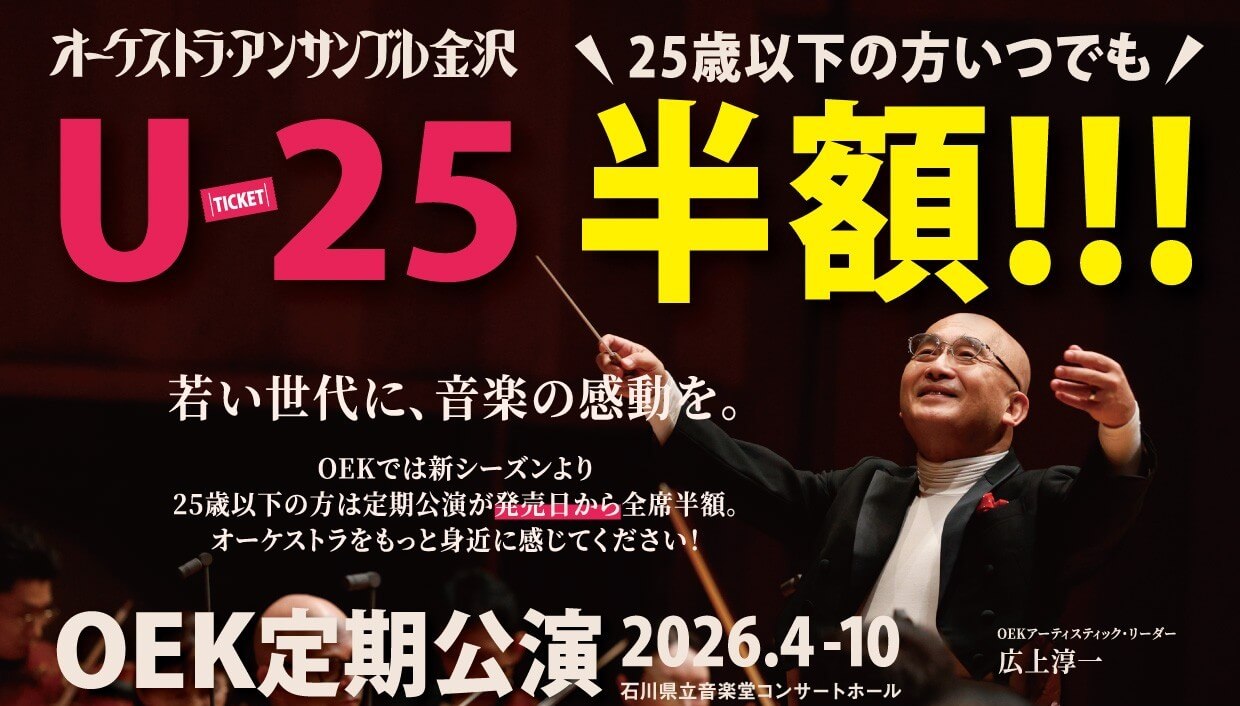 昨年まで、U-25(25歳以下)のチケット割引制度は、前日より電話予約で半額とさせていただいておりましたが、今年度よりOEKの定期公演は発売日から半額での販売にリニューアル!ぜひ日々の生活に音楽を♪